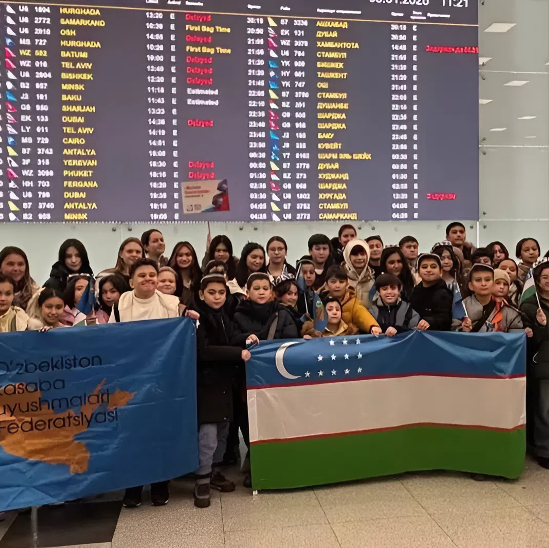 ўзбекистон делегацияси, мактаб ўқувчилари, москва сафари, домодедово аэропорти, болалар маданий алмашинуви, россия, касаба уюшмалари, ўқувчилар саёҳати