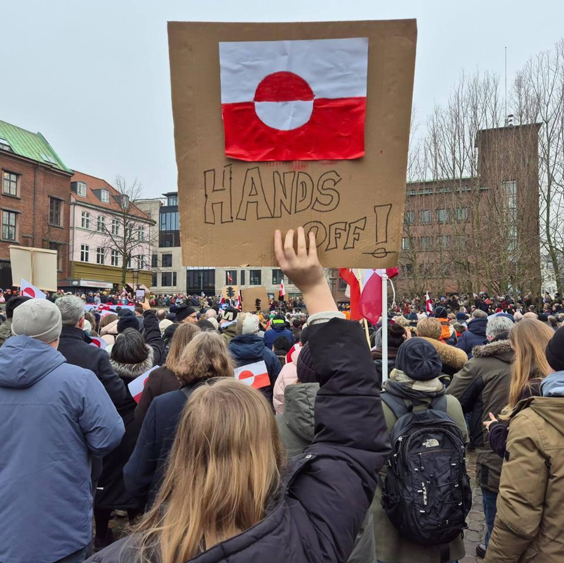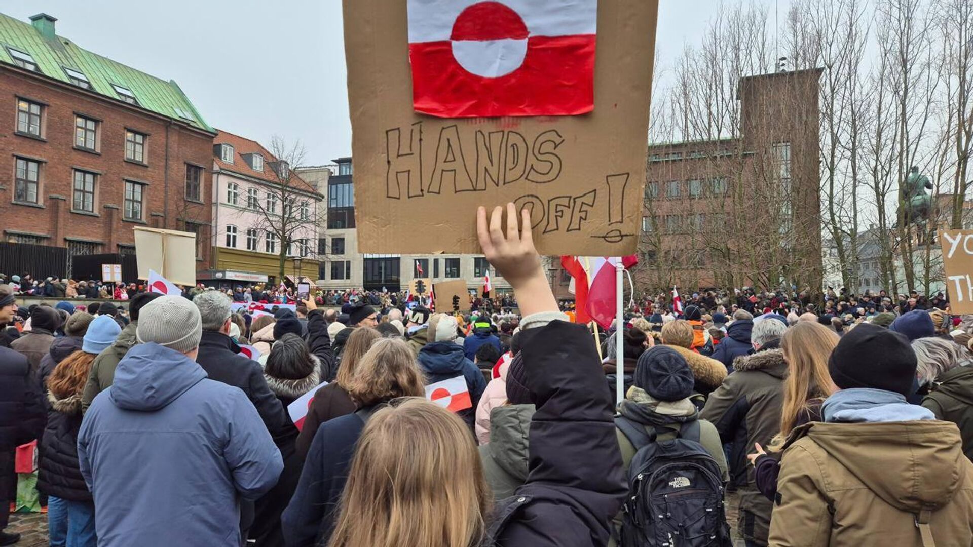Телеканал шуни таъкидлайдики, шунчалик кўп одамлар тўпланганки, уларнинг сонини аниқлашнинг иложи йўқ. Копенгаген шаҳар ҳокимияти олдидаги майдон бутунлай Гренландия байроқлари ва "Қўлларингизни узинг!" ва "Бирдамлик!" шиорлари туширилган плакатларни кўтариб турган намойишчилар билан тўлган.