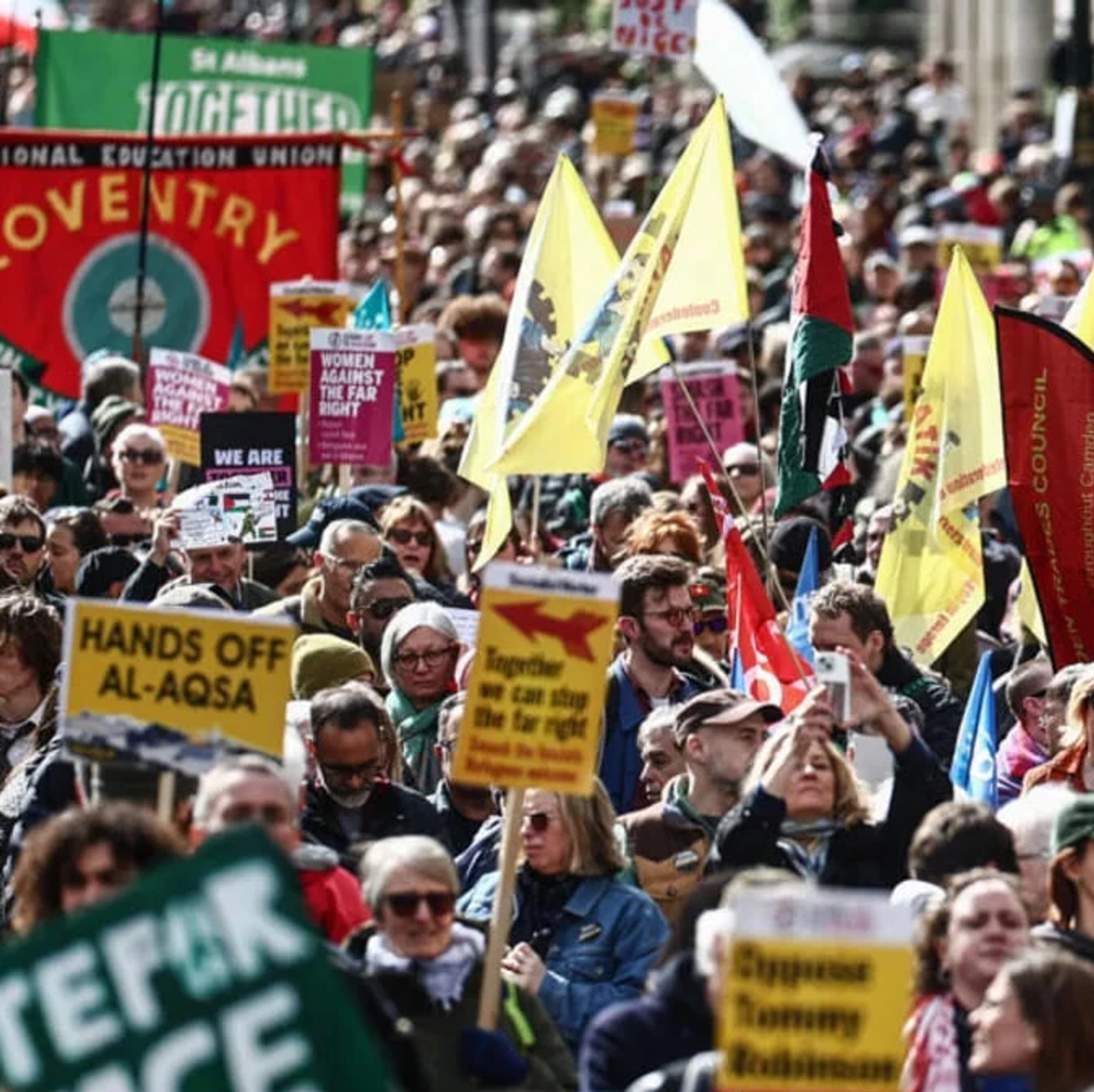 Буюк Британия, Лондон. Бу ердаги юриш асосан ўнг қанотга қарши бўлган, шунингдек, Эрон байроқлари ва Фалластинни қўллаб-қувватловчи баннерлари ҳам бўлган.